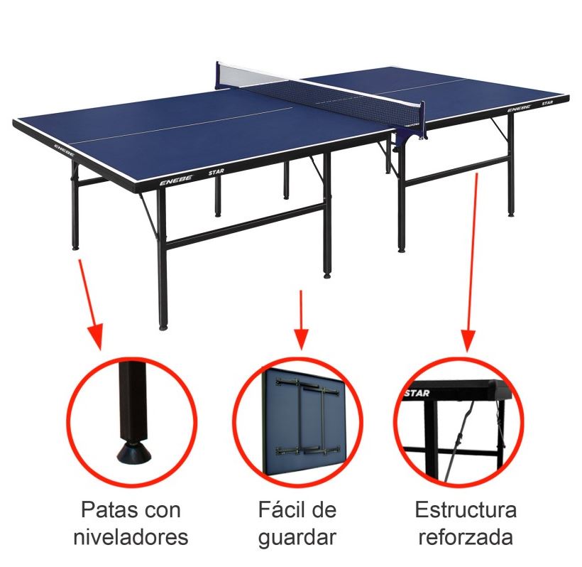 Mesa de ping pong de interior con tablero MDF de alta densidad (15 mm). Proporciona un bote natural y uniforme. Marco perimetral de 30×15 mm, aumenta la durabilidad del tablero y protege la estructura. Patas metálicas regulables (30×30 mm) con refuerzo de Ø 16 mm. Tablero MDF 15 mm. Cerco 30×15 mm. Armazón metálico 30×30 mm. Tirantes 16 mm. Incluye soportes y red. Dimensiones reglamentarias 2740 x 1525 x 760 mm. Peso 60 kgs. Marca: ENEBE®. Color: azul.