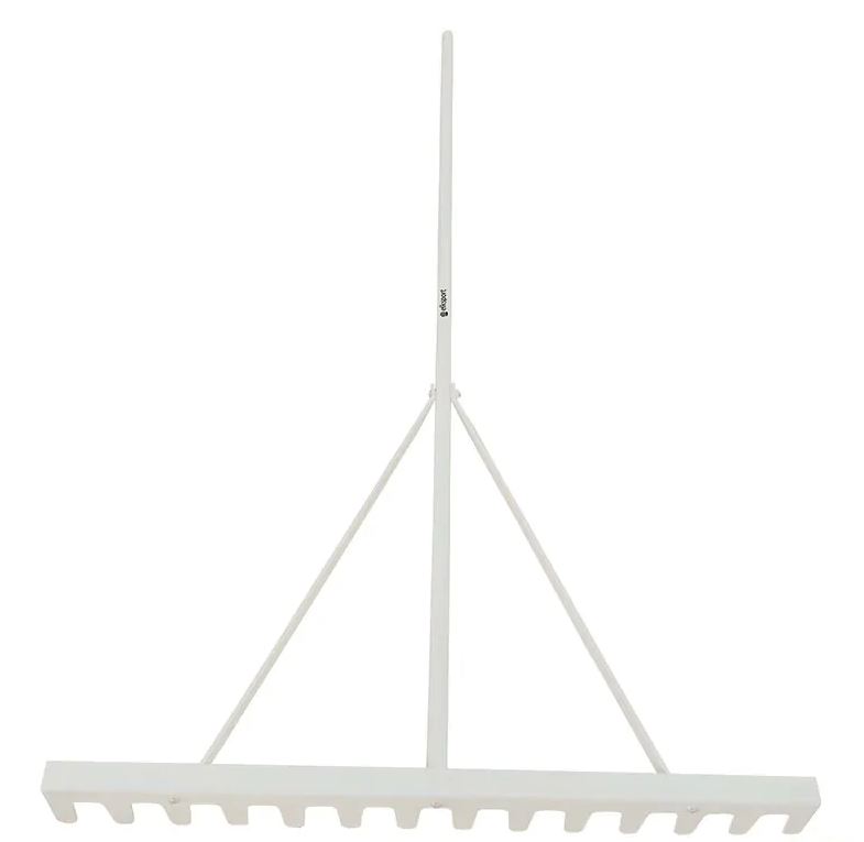 Rastrillo para la arena del foso de atletismo. Con mango metálico redondo que proporciona mayor alcance y resistencia durante el uso. Su base de acero es ideal para facilitar el rastrillado eficiente del foso. Longitud mango: 1.820 mm. Diámetro mango: 25 mm. Anchura base: 920 mm. Grosor base: 3 mm. Color: blanco.