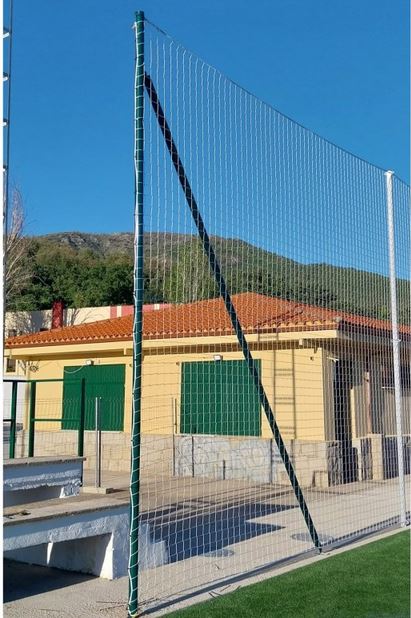 Poste metálico galvanizado de refuerzo para colocar en los extremos de los postes de las redes de protección de forma diagonal. Fabricado en hierro. El poste lleva una abrazadera para amarre al poste horizontal y pletina para atornillar al suelo. Está galvanizado para proteger de la oxidación antes una alta corrosión como en zonas costeras. La sección es de 80×2 mm. Peso aproximado por unidad 27 kg. No incluye botes. Montaje no incluido.