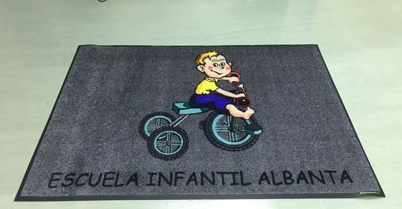 Alfombras personalizadas, para interior o exterior. Ideales para colocar en la entrada de un centro escolar o en el interior de cualquier negocio. Todos los componentes de nuestras alfombras y felpudos son de la mejor calidad industrial existente. La superficie esta compuesta de hilo de nylon 100% de alta torsión de poliamida y su base es de goma de nitrilo 100%, siendo absolutamente antideslizante, están producidas en su totalidad en la UE, cuentan con los más exhaustivos controles de seguridad y son sometidas a rigurosas pruebas por laboratorios independientes. Nuestras alfombras personalizadas con logotipo, lisas y jaspeadas, facilitan el mantenimiento y limpieza de las instalaciones, reteniendo el polvo, la humedad y suciedad entre sus fibras. Son lavables, de larga duración y tienen una enorme capacidad antideslizante, pues su base de caucho las hace prácticamente inamovibles. No existe mejor calidad en el mercado europeo. Garantizadas de por vida. Ver foto con la gama de colores alfombra.