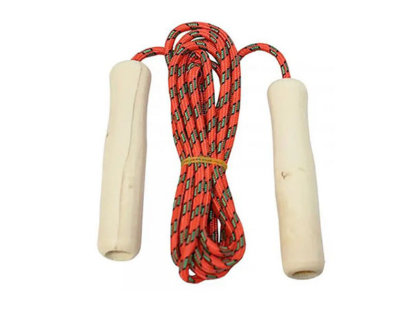 Cuerda o comba fabricada en poliéster. Con mangos de madera. Longitud: 2,80 cm. Color cuerda: blanca. Color mango: amarillo, azul, rojo, verde, negro.