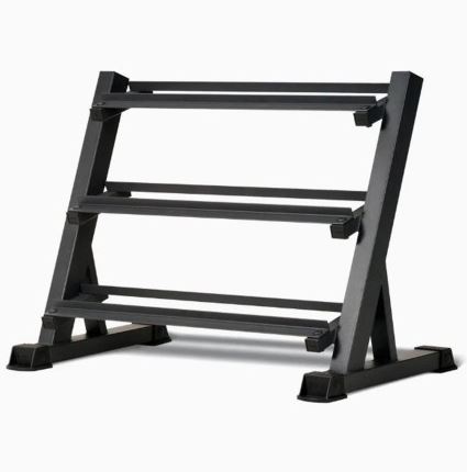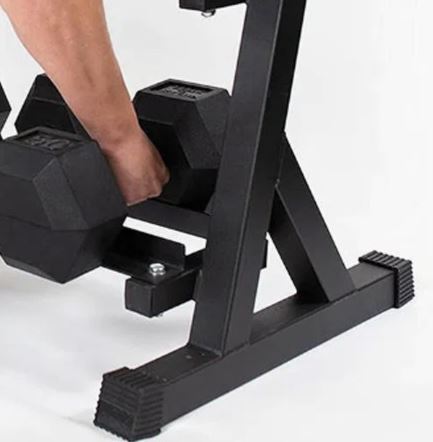 Mancuernero diseñado para el almacenamiento seguro y ordenado de mancuernas hexagonales. Cuenta con estantes en ángulo que facilitan la colocación y retirada de las mancuernas, mejorando la ergonomía y el acceso durante el entrenamiento. Incorpora tapas de goma antideslizantes y anti-arañazos. Su estructura triangular proporciona una estabilidad extrema, incluso con cargas elevadas. Fabricado en tubo de acero de 60x60x2 mm, ofrece una construcción robusta y duradera. Dispone de 3 niveles y un sistema de ajuste del soporte, que permite adaptarse a diferentes medidas de mancuernas según su peso, garantizando una correcta sujeción y organización. Medida del mancuernero: 135x57x88 cm. Color: negro.
