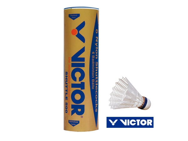 Bote de 6 volantes de bádminton. Base de corcho portugués y faldón de nylon. Iniciación, escolar. Velocidad media. Marca: Victor. Modelo 500 Bronce. Color blanco.
