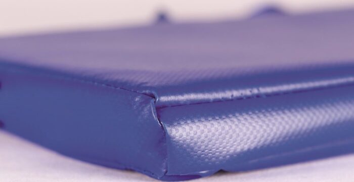 Cubierta fabricada en tela de poliéster recubierta de PVC, cosidas con cremallera, ollados para evacuación de aire y asas para su transporte. Espuma interior fabricada en poliuretano, disponible en 3 grosores. Densidad 30 kgs/m3. Color: azul.