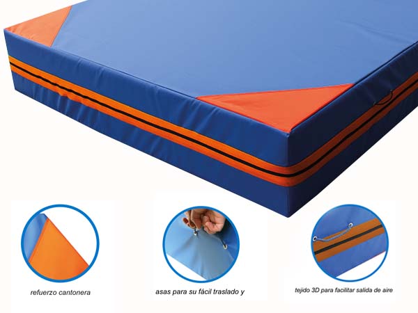 Funda quitamiedos fabricada en lona plastificada de pvc clase b2 ignífuga de primera, lacado a dos caras, combinada con tejido 3D ideal para permitir la salida de aire y cremallera que permite su fácil sustitución. Con costuras dobles realizadas en la parte interior de la funda quedando la parte exterior libre de cualquier punto dañino. Incluye refuerzos en las esquinas, ollados metálicos y asas de quita y pon para su fácil traslado. Medida 300×200 cm. No incluye relleno. Disponible en 4 grosores. Se venden por unidad. Color: azul/naranja.